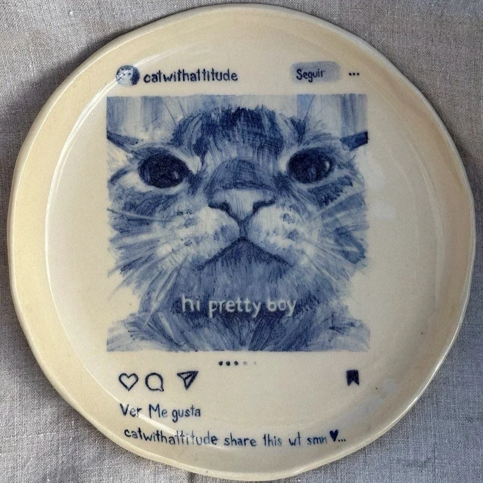 Infodemia, Hi pretty boy. 2025. Arcilla blanca, cobalto, esmalte. 23 x 23 x 2 cm.