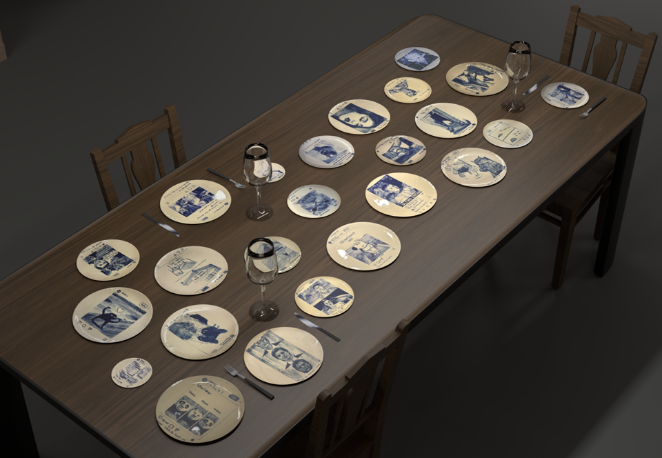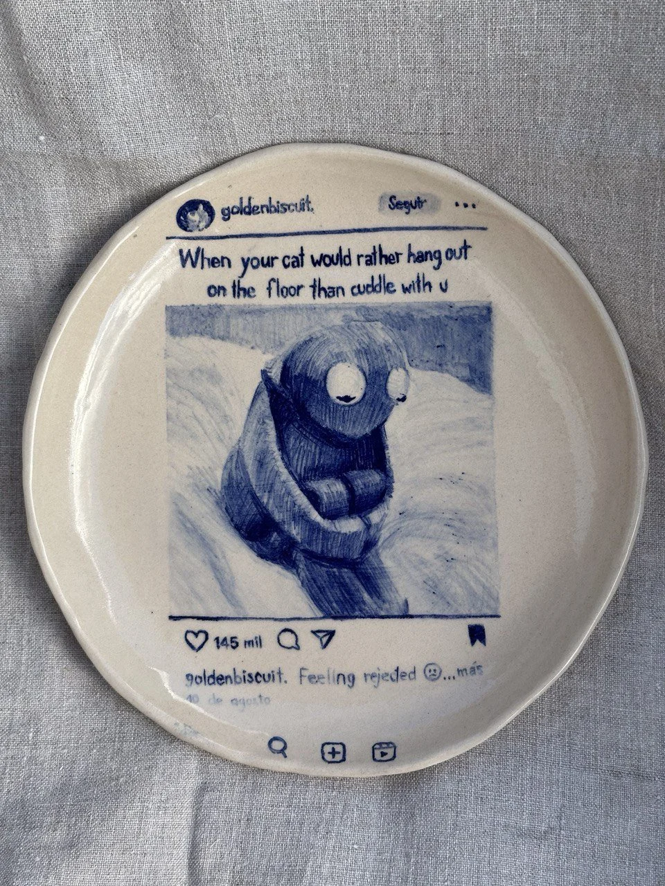 Cada plato -pintado a mano con pigmento azul cobalto que evoca la luz de las pantallas- simboliza una hora del día, representando el exceso de consumo visual que caracteriza nuestra relación cotidiana con lo digital.
