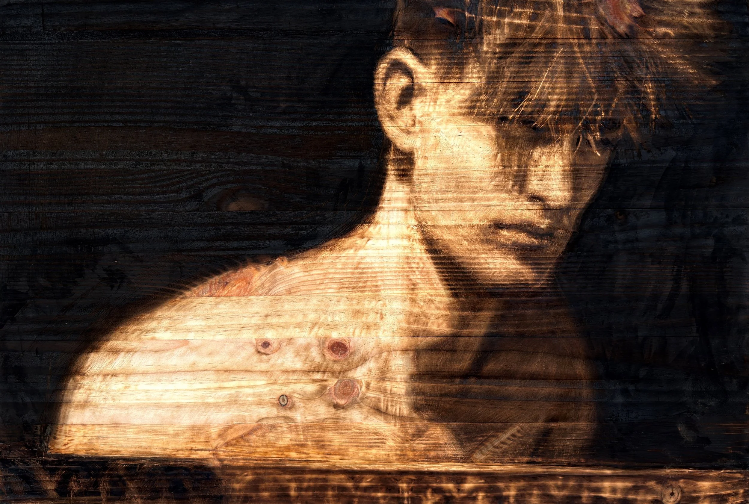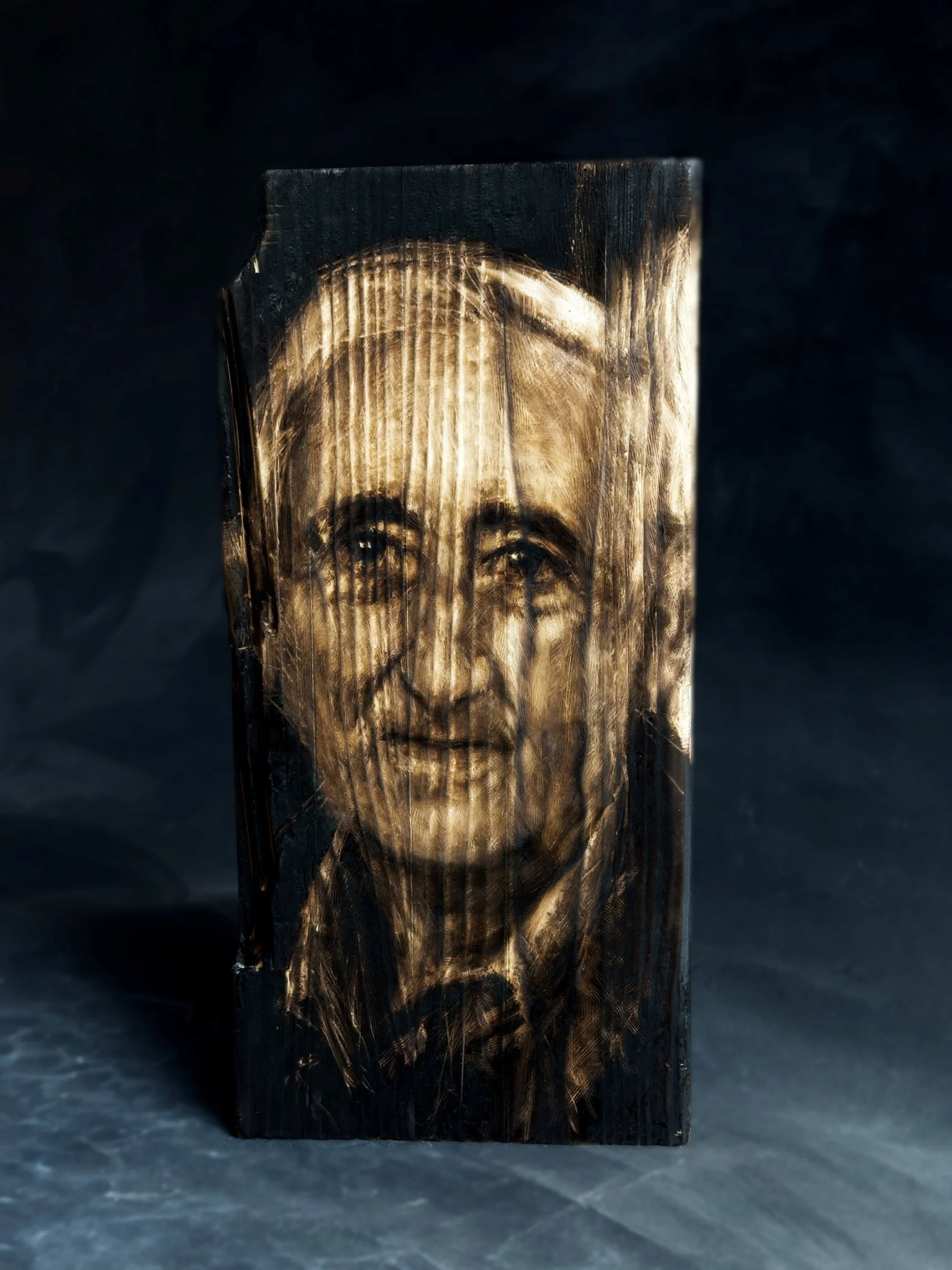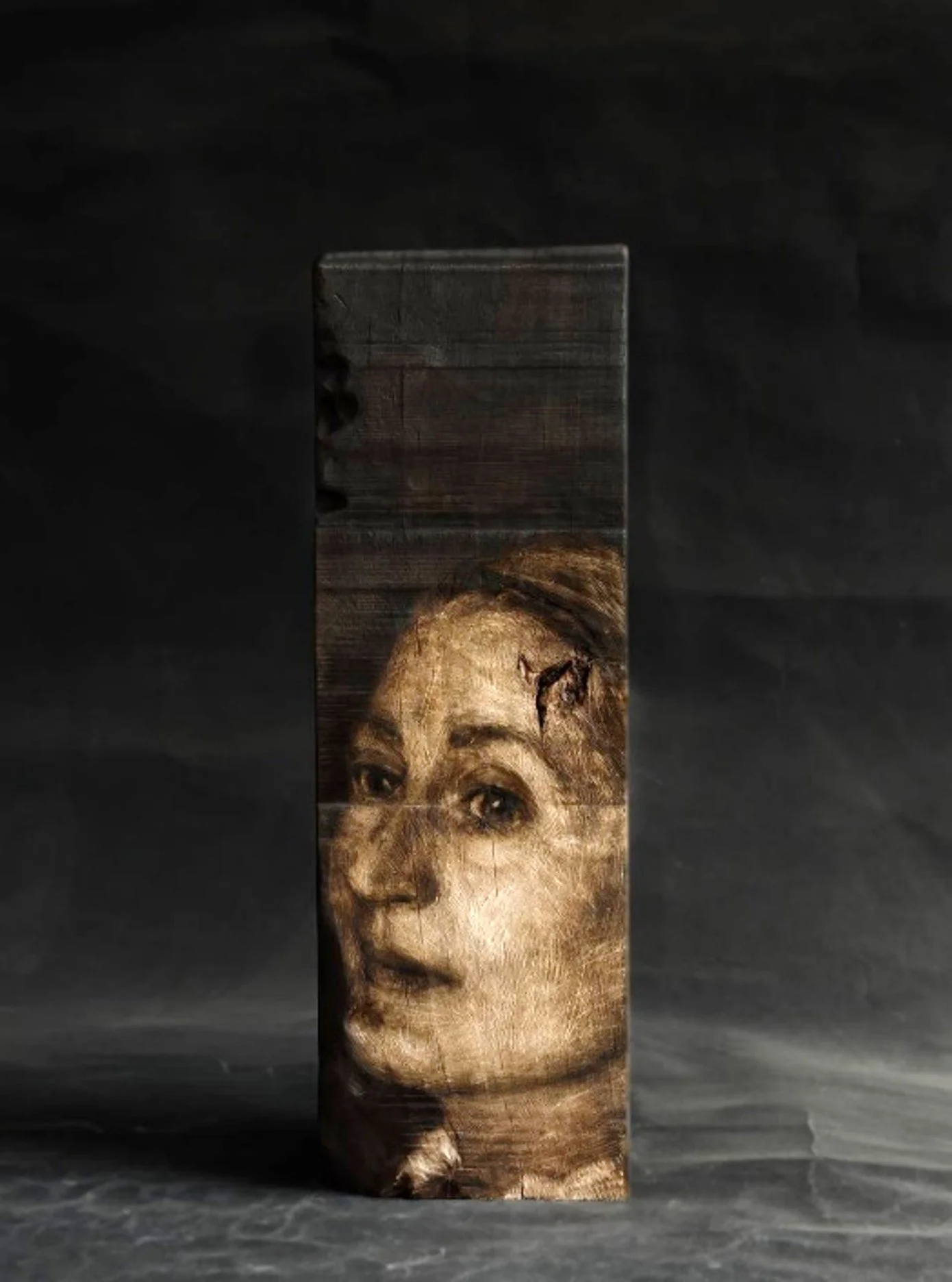 A series of portraits exploring introspection and isolation. Enveloped in chiaroscuro, each figure inhabits a space where sound fades and only inner reflections remain. The wood and traces of fire allude to the passing of time, transforming silence into a dense and eloquent presence. The portraits depict primarily my own family - my mother, my father and my twin brother - with whom I share a deep emotional bond that allows me to reflect their vulnerability and strength. In the portrait of my mother, inspired by Vermeer's Girl with a Pearl Earring, I divert her gaze to highlight her resilience and the beauty of time's passage against contemporary standards. My brother's portrait, in contrast, addresses the disorientation and existential crisis of a young generation marked by precarity and uncertainty, inviting reflection on human fragility in the present moment.