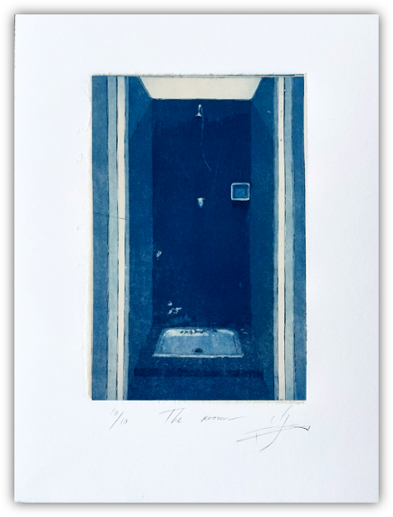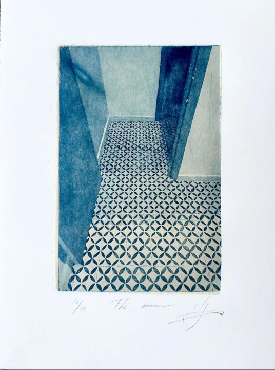 Realicé una serie de grabados titulada The Room, donde el vacío se convierte en protagonista. Mediante las técnicas de aguatinta y aguafuerte, transformo las habitaciones vacías del estudio y del museo de Fabero en espacios simbólicos donde la ausencia y el silencio dialogan. En The Room I, el patrón geométrico del suelo contrasta con las paredes desnudas y la apertura de la puerta, sugiriendo una invitación a lo desconocido. Estas obras abordan el silencio como un campo de introspección más que como ausencia de sonido, invitando al espectador a enfrentarse a su propia percepción del vacío. La sutileza de la aguatinta refuerza la atmósfera etérea de los espacios, donde el silencio se hace presencia y el vacío actúa como espejo para la reflexión y la creación.